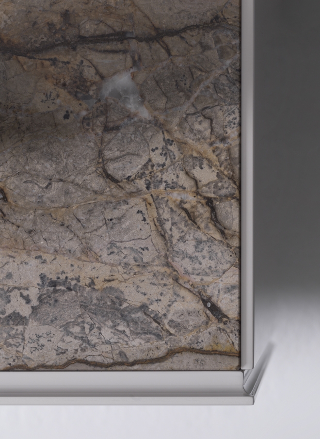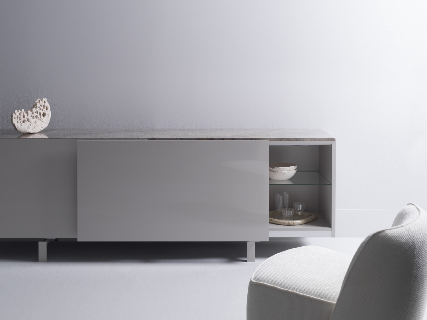 Teatro introduces an architectural dimension through coplanar sliding doors that ensure surface continuity. The matt lacquer, matching the fronts, reinforces the unity of the volume. Movement reveals or conceals the interior.
