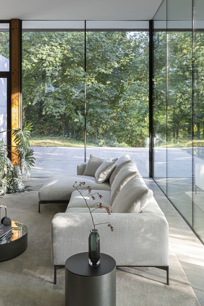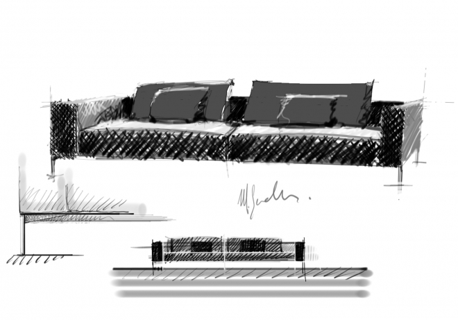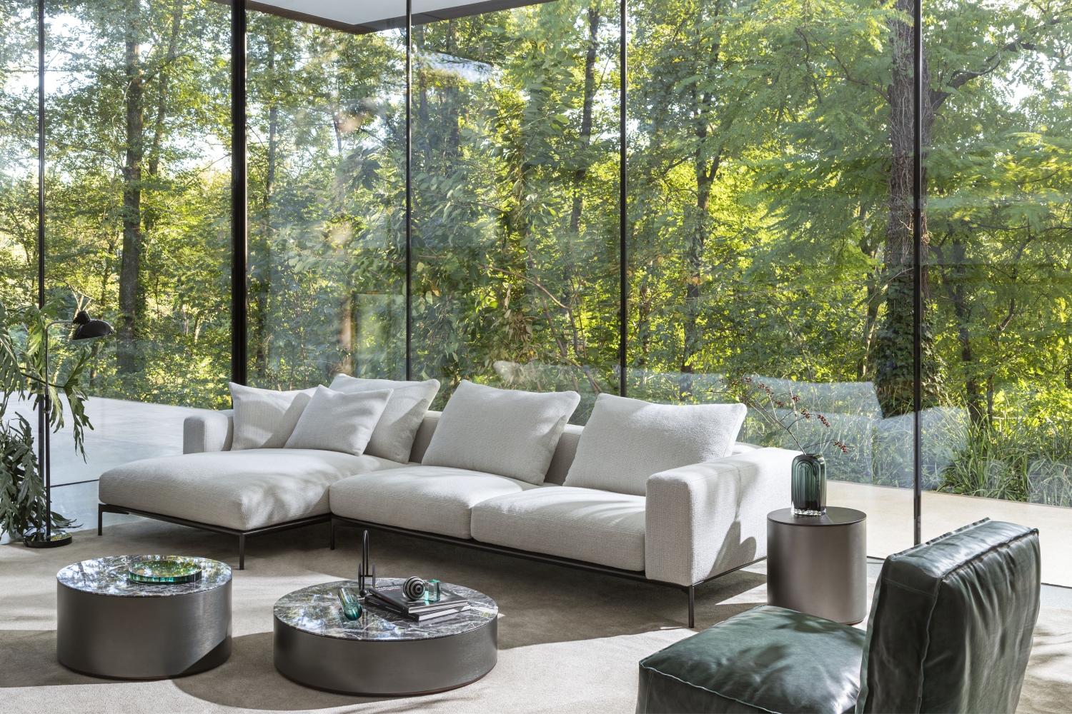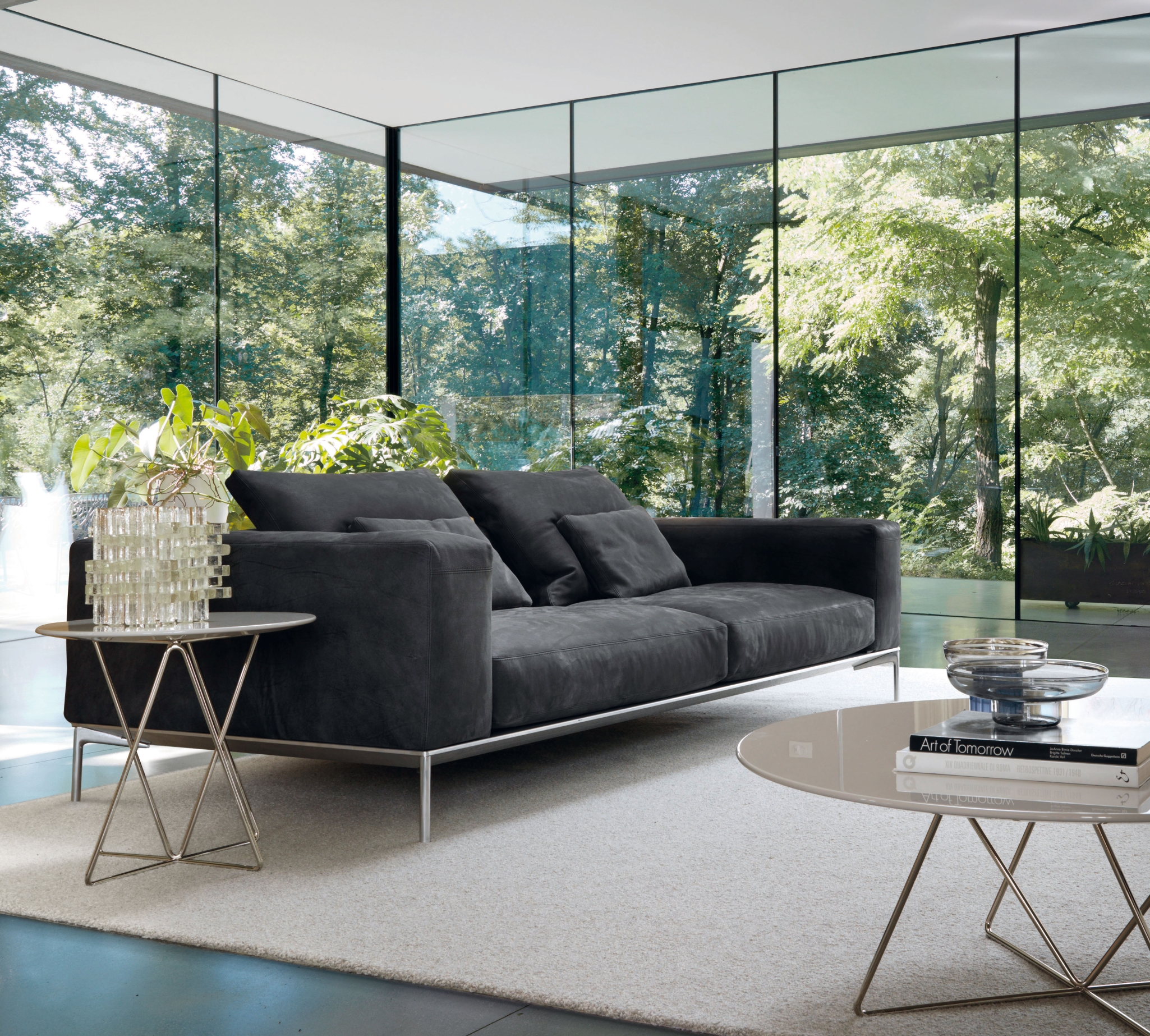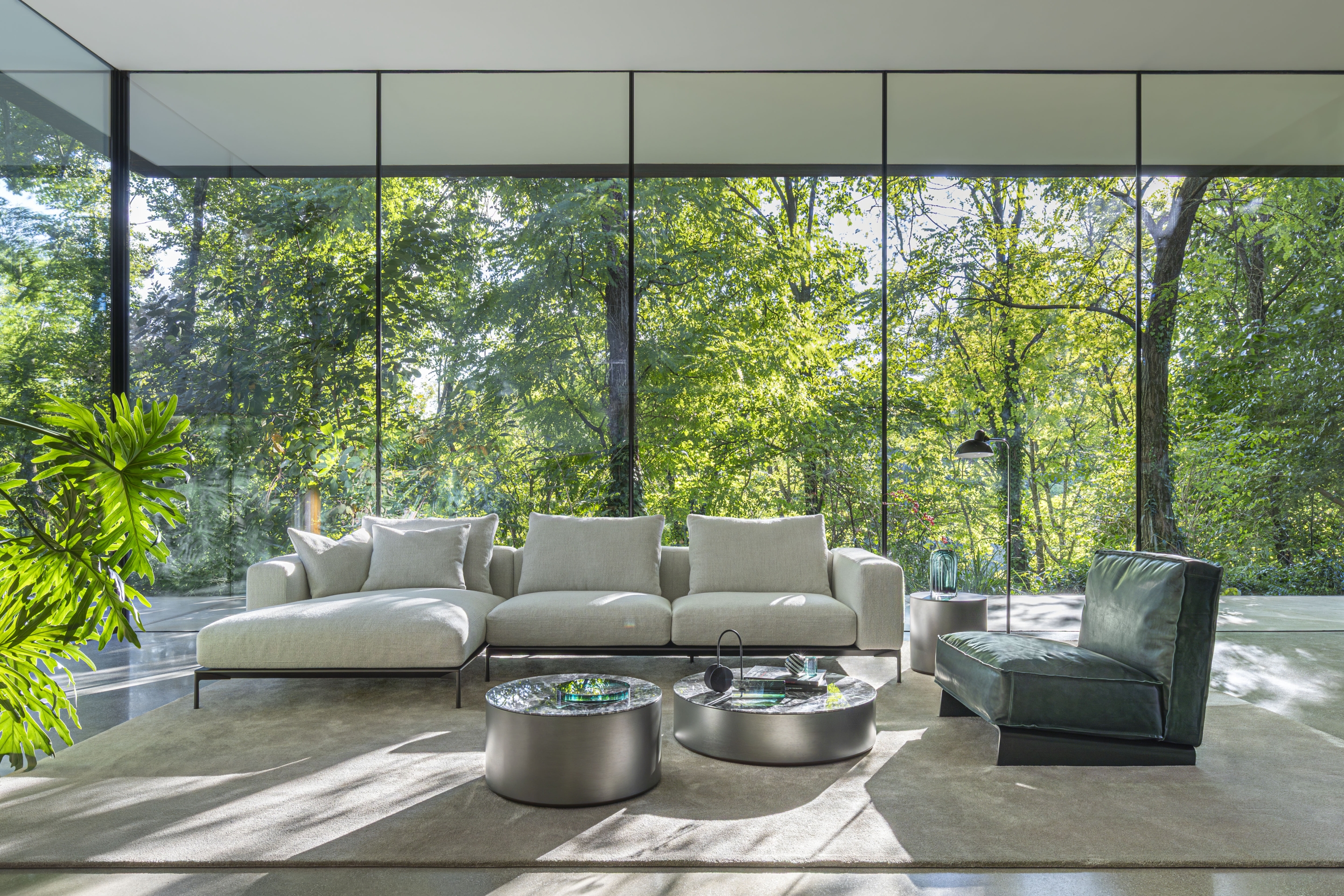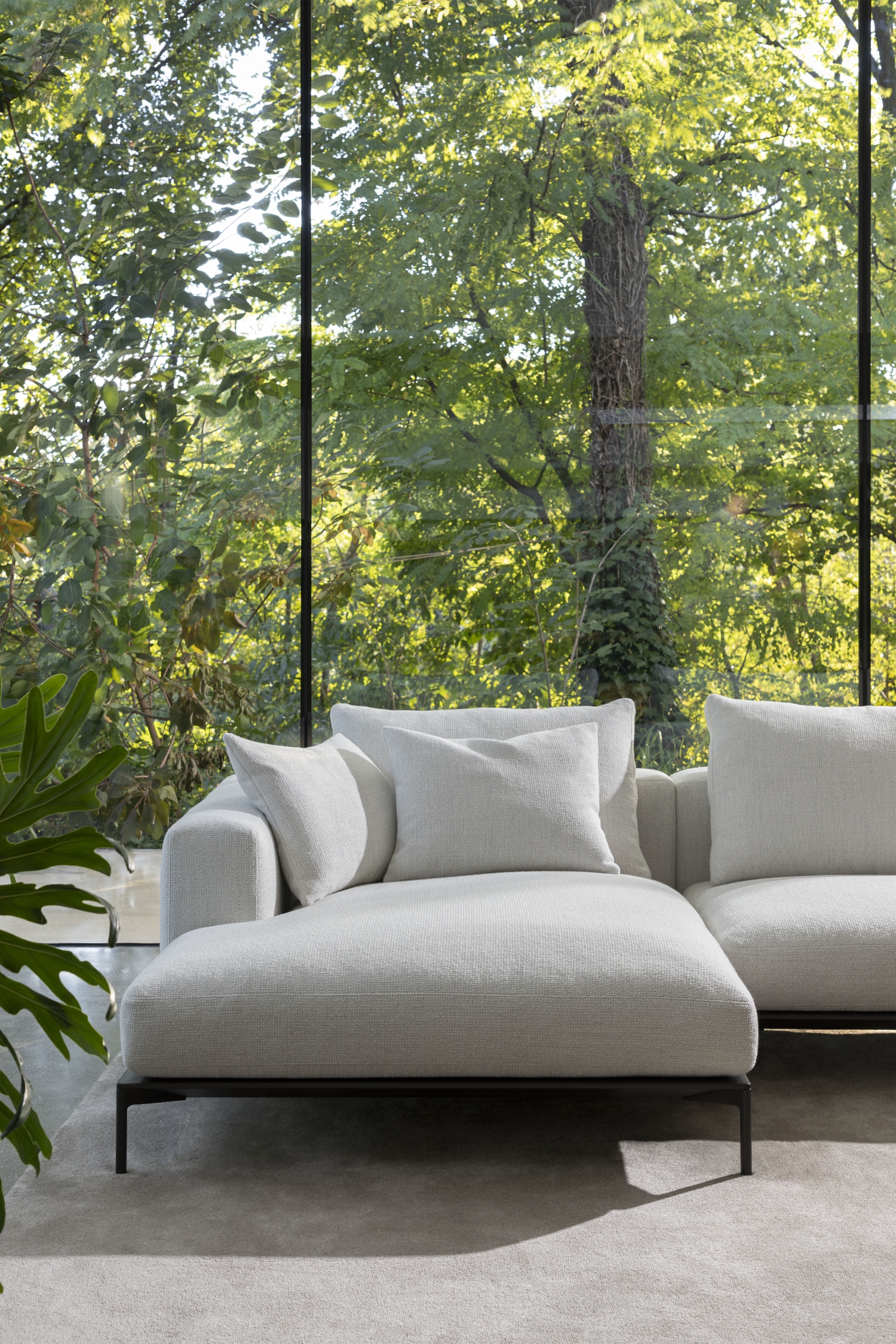 Élégant design arrondi où la légèreté et la sobriété des garnissages informels dialoguent de façon harmonieuse avec la structure et les pieds en aluminium.
