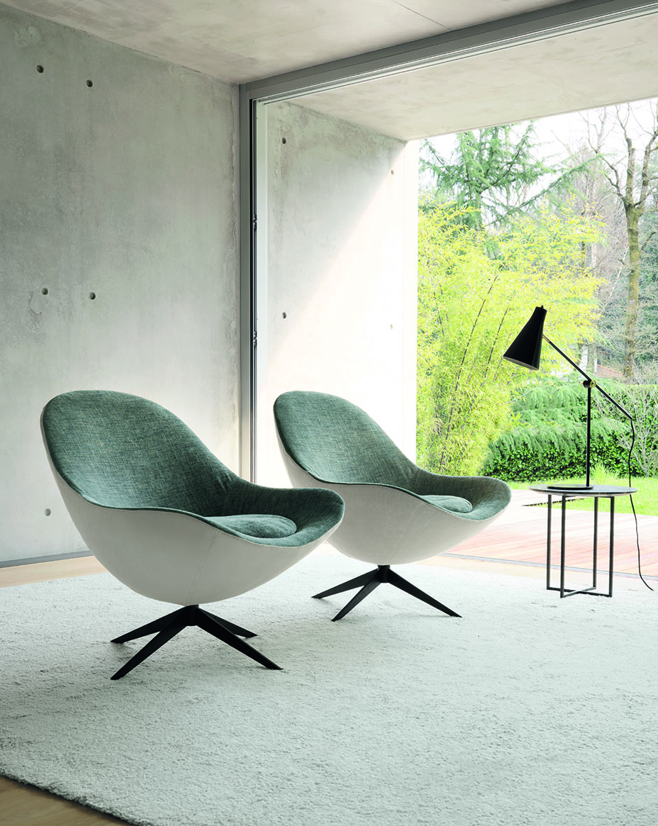 Moelleux et rassurant, posant délicatement sur son piètement en métal, élégant et royal. Il offre un dialogue agréable entre la courbure du dossier et de l’assise et le piètement en forme de trépied aux lignes marquées.