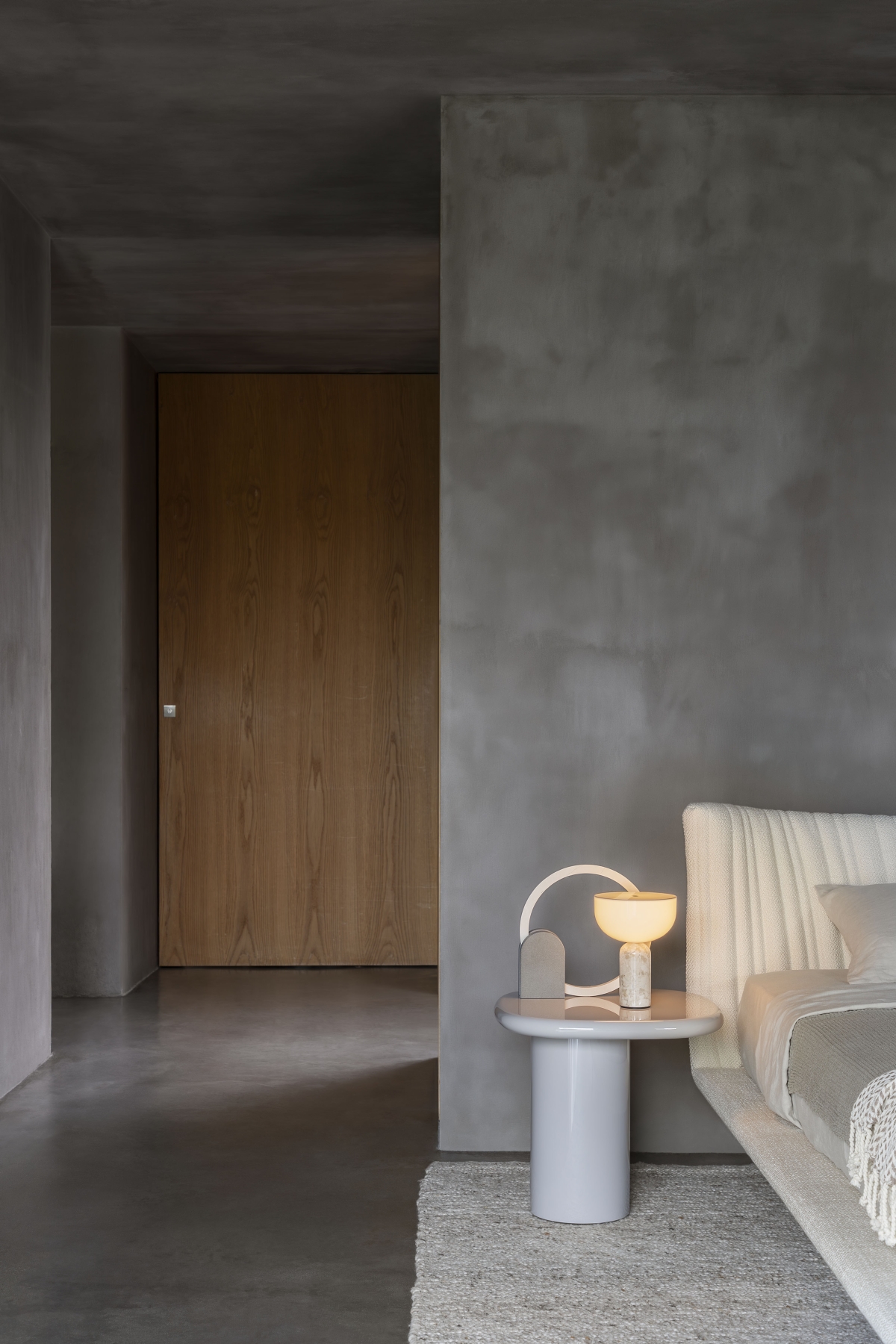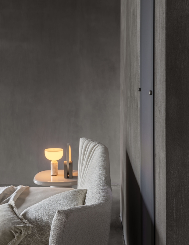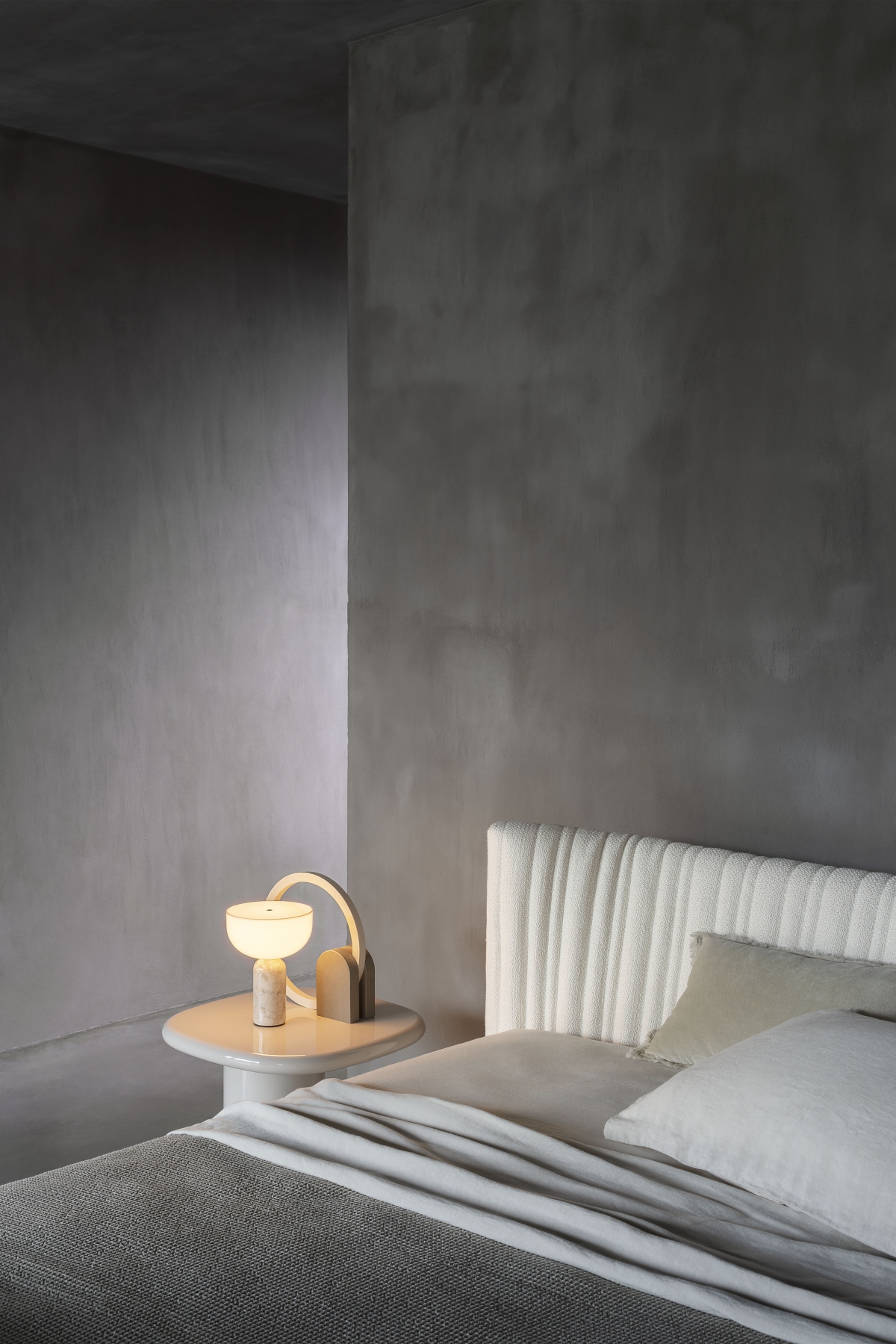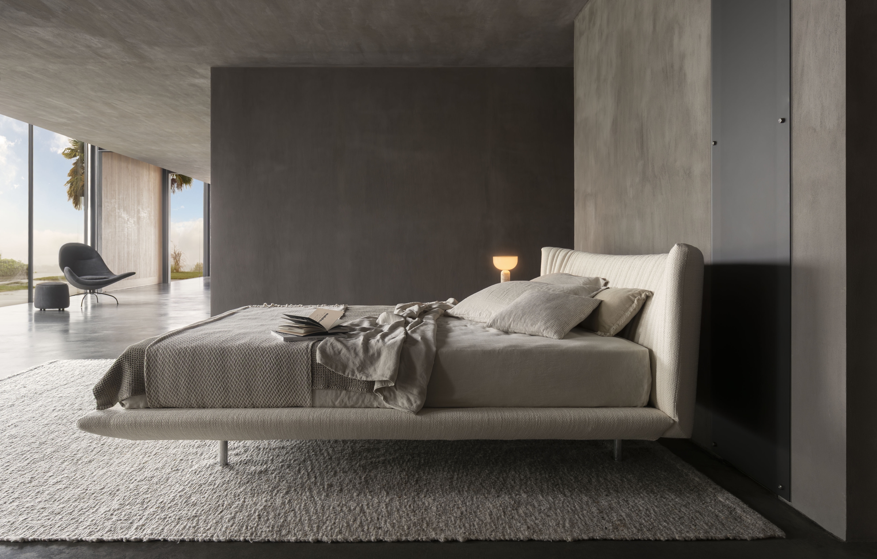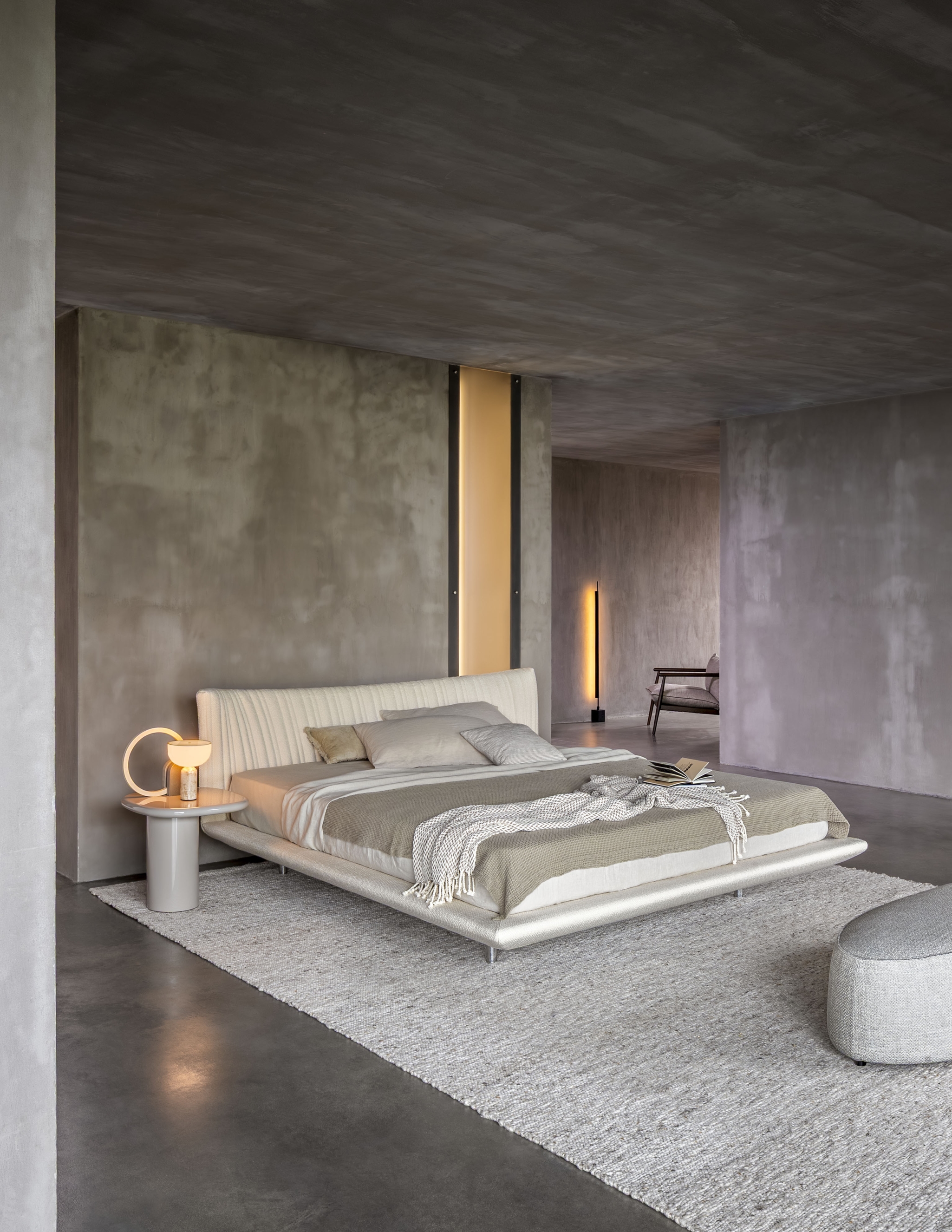 Naturellement moelleuse, la tête de lit douce et sinueuse, réalisée avec un revêtement matelassé formant des plis verticaux irréguliers, exalte la légèreté du cadre de lit incliné vers l’intérieur.