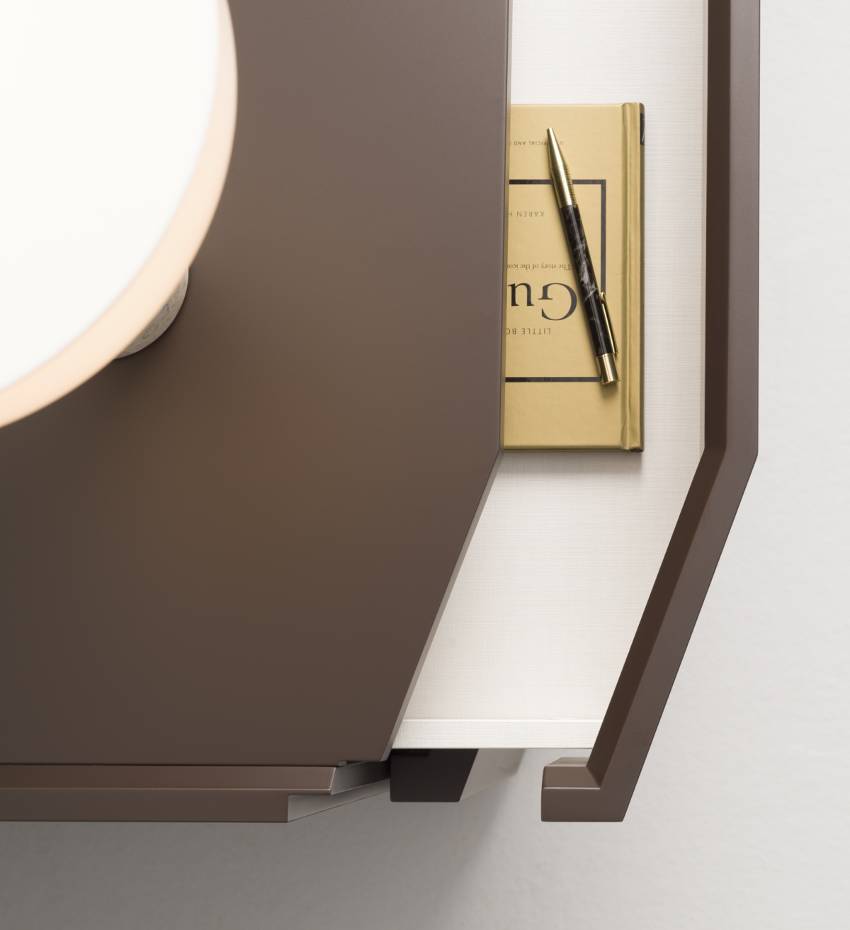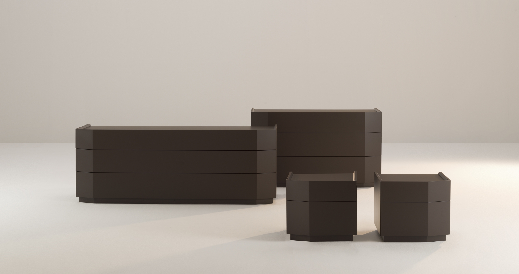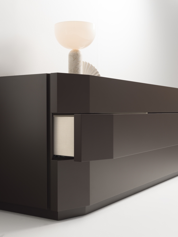 Contenitore dal carattere discreto e solido. Il volume compatto è definito da superfici regolari e frontali a cassetti. L’unione di frontali inclinati e fianchi crea una gola integrata. Disponibile in più dimensioni, adatto anche alla zona notte.