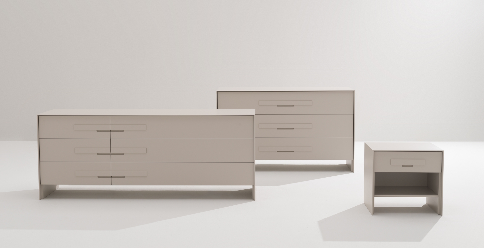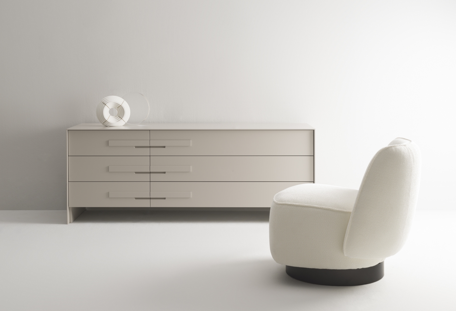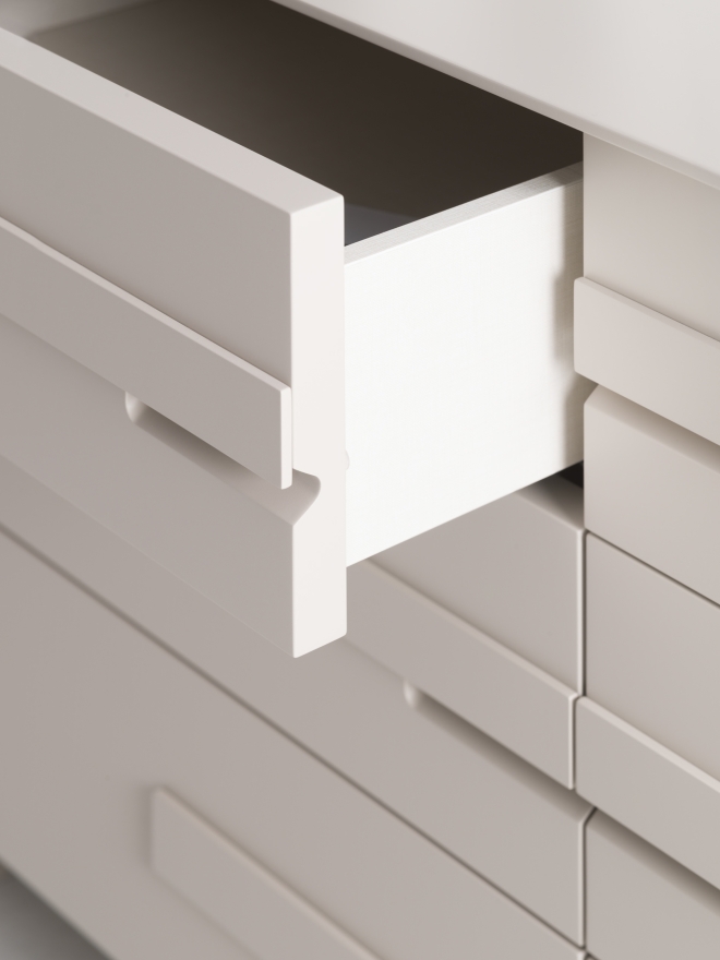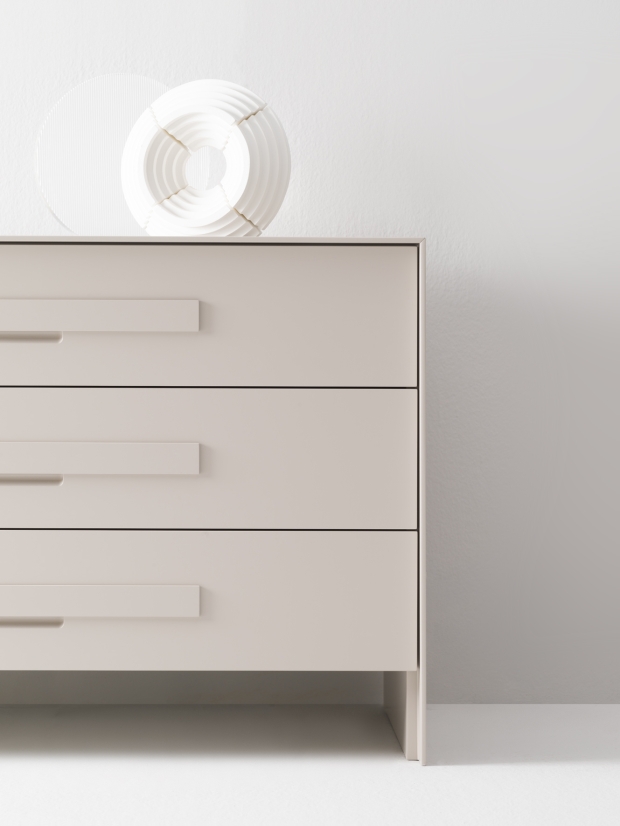 Silenzio si articola in una sequenza di cassetti con maniglia distintiva, che genera un ritmo ordinato. Linee essenziali e proporzioni calibrate definiscono una presenza composta. Un contenitore funzionale, adatto anche alla zona notte.